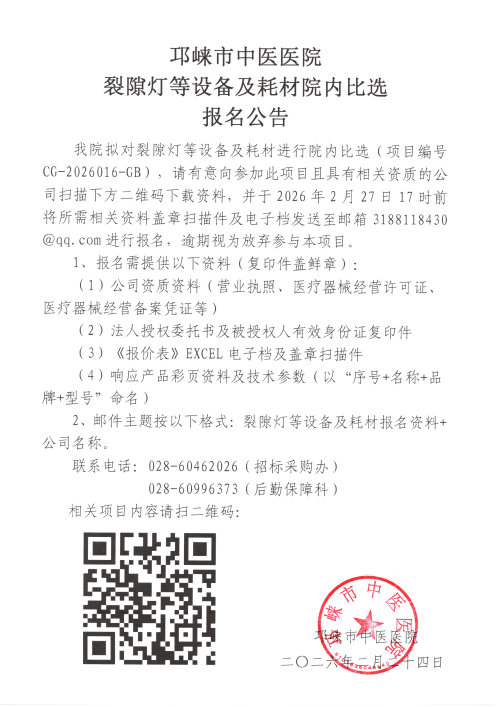 裂隙灯等设备及耗材院内比选报名公告