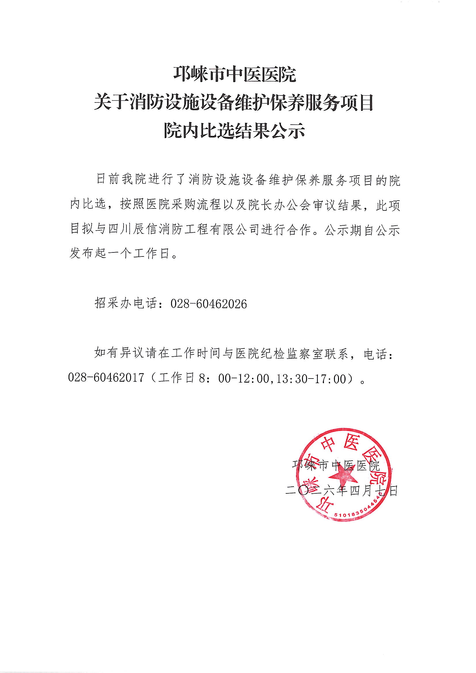 关于消防设施设备维护保养服务项目院内比选结果公示