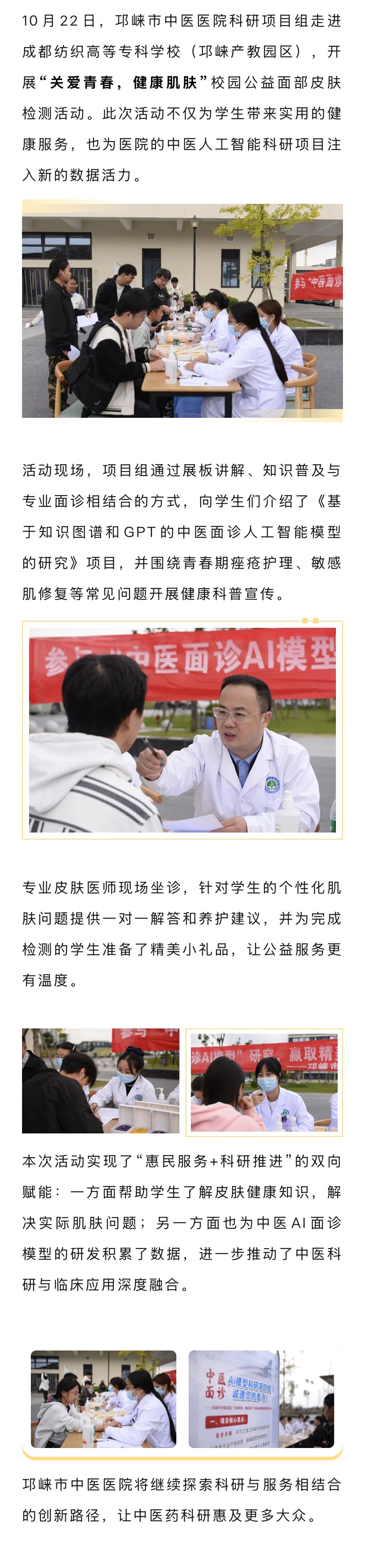 邛崃市中医医院成立于1956年, 1983年由原县中医院和原城关医院合并组建邛崃县中医医院,1994年医院随邛崃撤县建市更名为“邛崃市中医医院”,经过几代人不忘初心、砥砺奋进,医院现已成为集医疗、教学、科研......