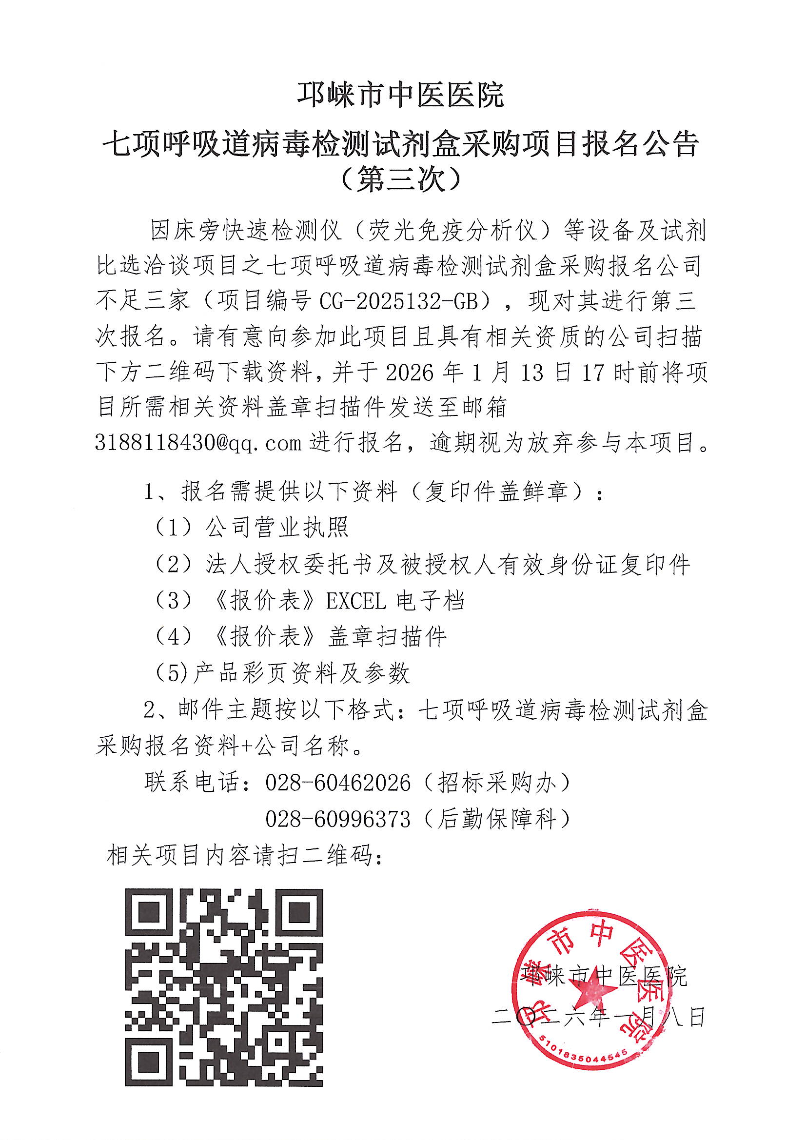 七项呼吸道病毒检测试剂盒采购项目报名公告(第三次)