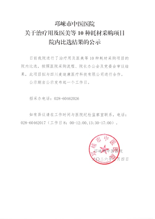 关于治疗用及医美等10种耗材采购项目院内比选结果的公示
